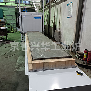 爐體與臺(tái)車均由型鋼及鋼板焊接后與砌體組成。臺(tái)車兩側(cè)與爐體之間的間隙用耐火纖維密封,并固定在爐體上。爐體與臺(tái)車之間連接著大、小拉桿以便放置拖纜軟線。